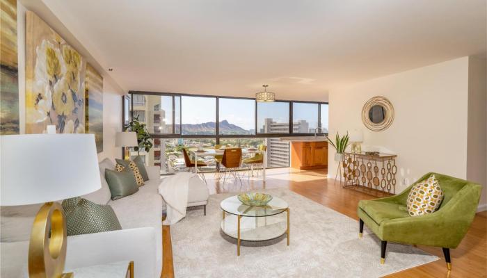 2724 Kahoaloha Lane unit 2106 is a condo in the Kings Gate building located in Honolulu, HI. This is a 2 bed, condo in the Moiliili neighborhood. This apartment has 1049 sqft interior space with Cemetery, City, Diamond Head, Mountain, Ocean, Sunrise views. Unit #2106 is located on floor number 21 and the property condition is excellent,above average. The neighborhood is Moiliili and the full address is 2724 Kahoaloha Lane unit 2106, Honolulu, HI, 96826.